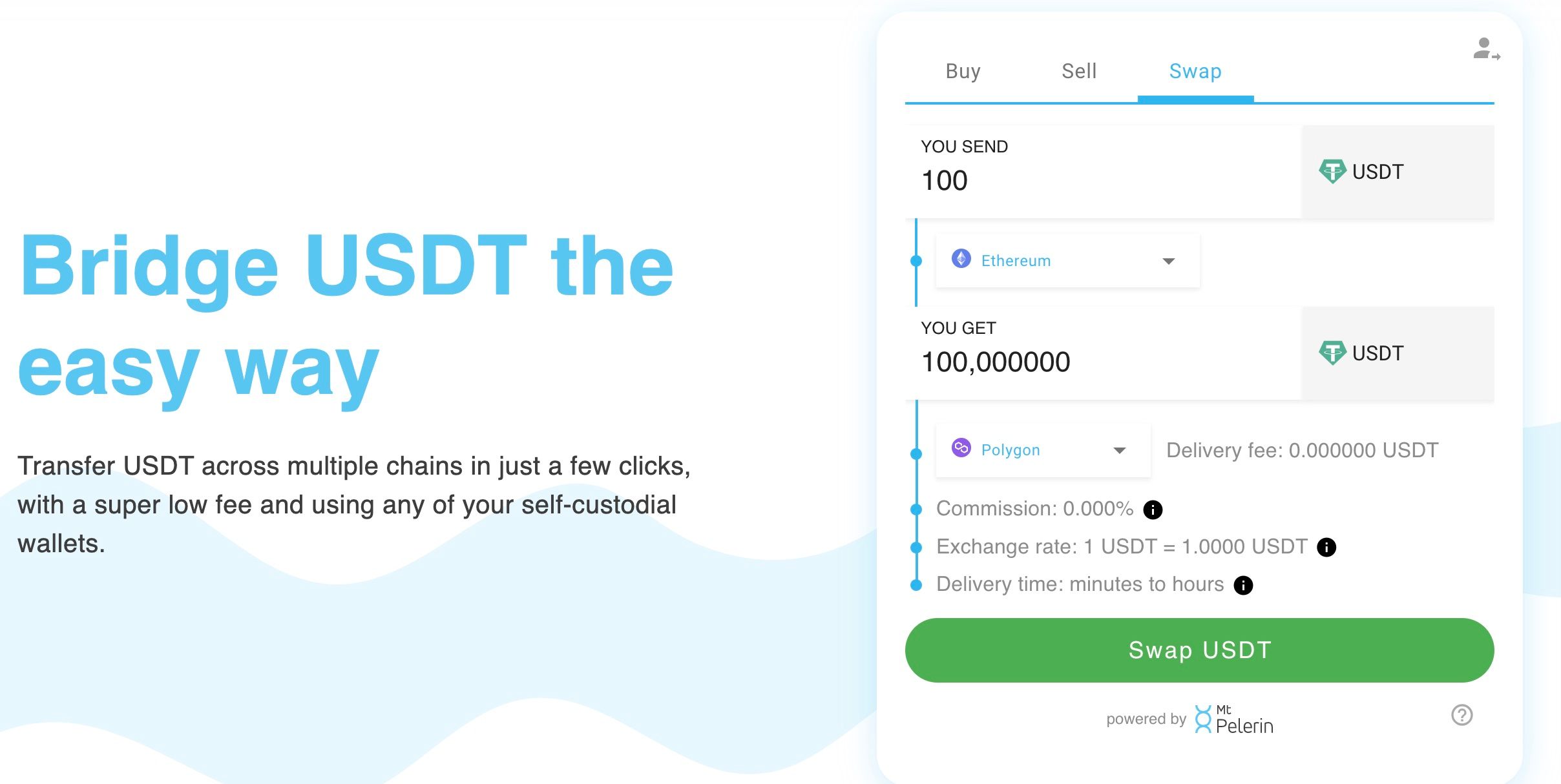 A Look at Bridging USDT From Ethereum to Polygon. Image via Mt PelerinUsers can Bridge assets across multiple chains in just a few clicks with low fees using their self-custodial wallets, it doesn’t just support the Bridge Wallet.