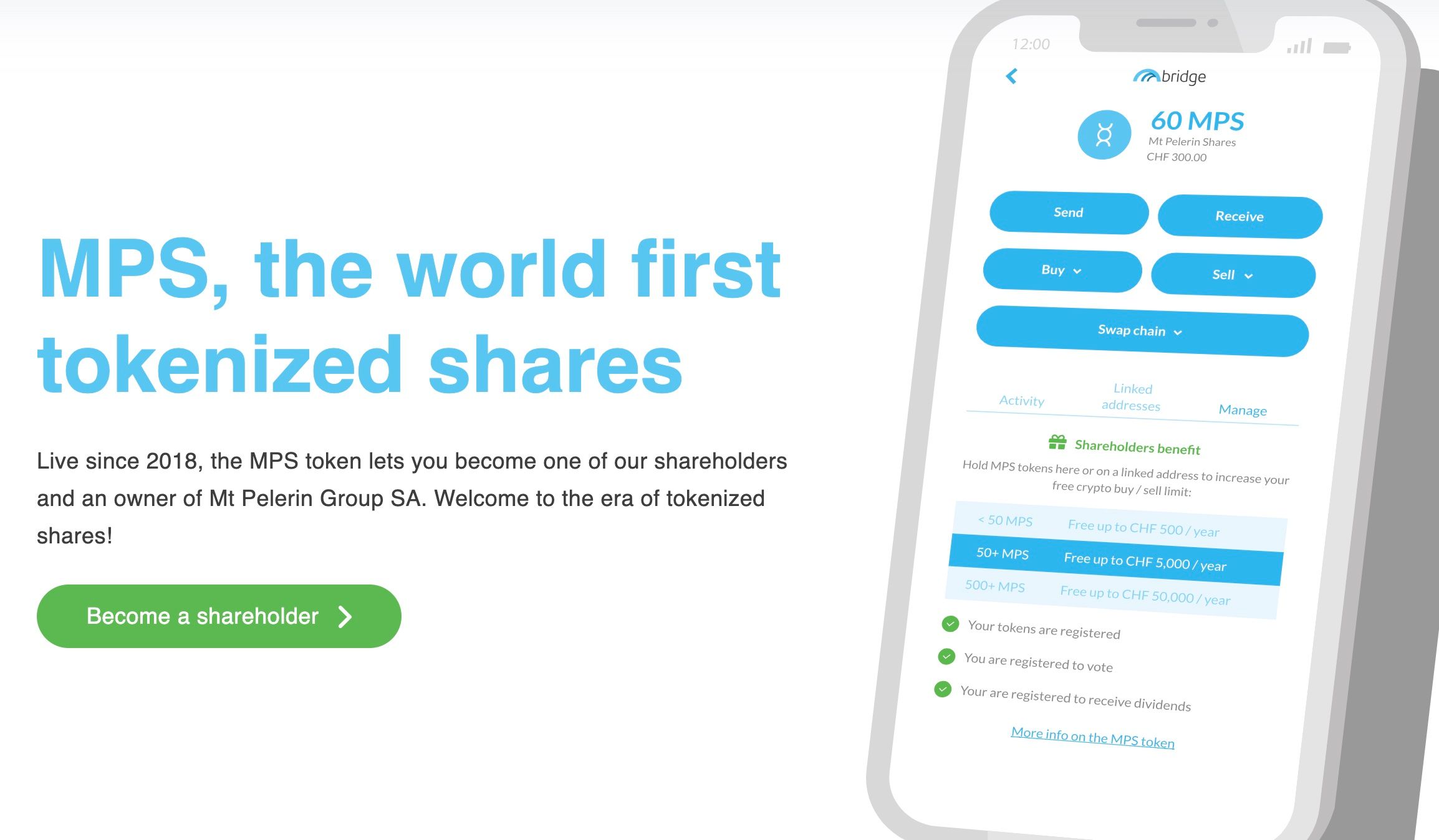 Mt Pelerins Bridge Wallet is also a great way to interact with tokenized assets such as MPS Share-tokens and other digital securities issued on the Bridge Protocol, asset tokenization platform.