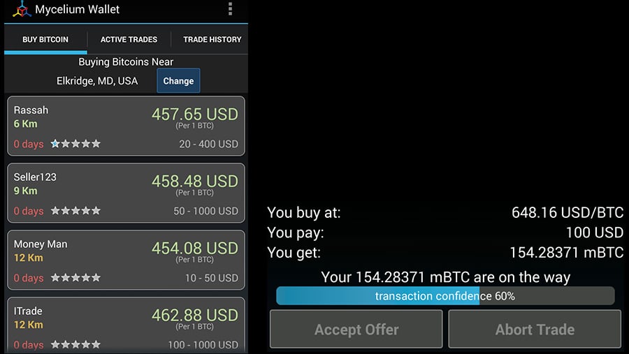 Another nice touch is the inclusion of a peer-to-peer marketplace to help you trade with locals. With one touch the MyCelium wallet will show you Bitcoin buyers and sellers within your local area.