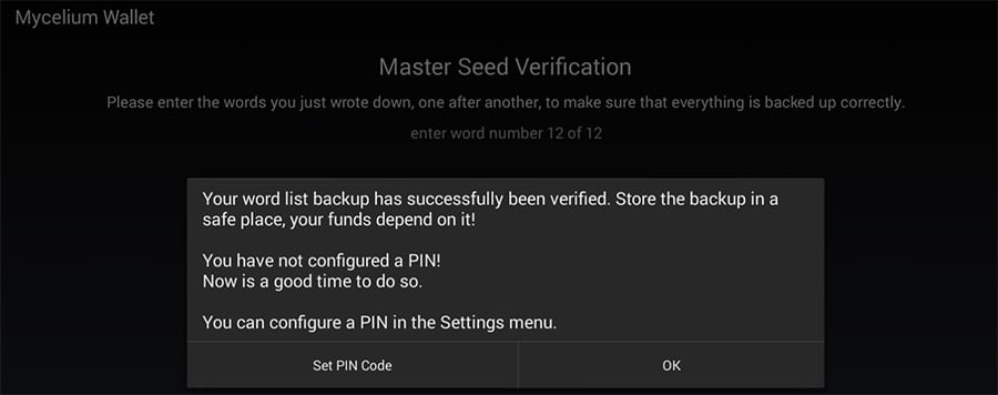 Fill out your master Seed word for WordThen tap “Set PIN Code” to create a six-digit PIN and ensure no one can change your seed in case of loss or theft. This step will encrypt your wallet keys on the device. Hence, if anyone is able to get a hold of your phone, they cannot access the keys without decrypting it with your password.