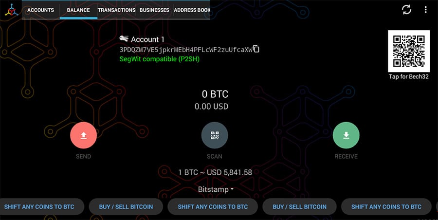 When you open the app you’ll understand quickly why users like it. You’ll find a simple and uncluttered interface that presents you with your wallet and easy to read tabs. You’ll see the current BTC exchange rate, as well as send and receive buttons and an easy to use QR code.