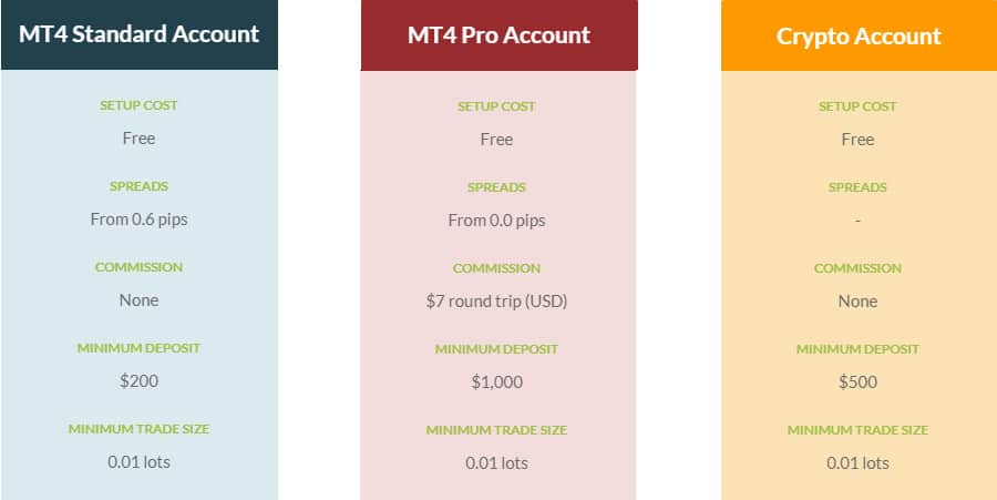 There are three different account types that you can make use of at MyFX Markets. These are their Standard and Pro Forex accounts and their Crypto account.