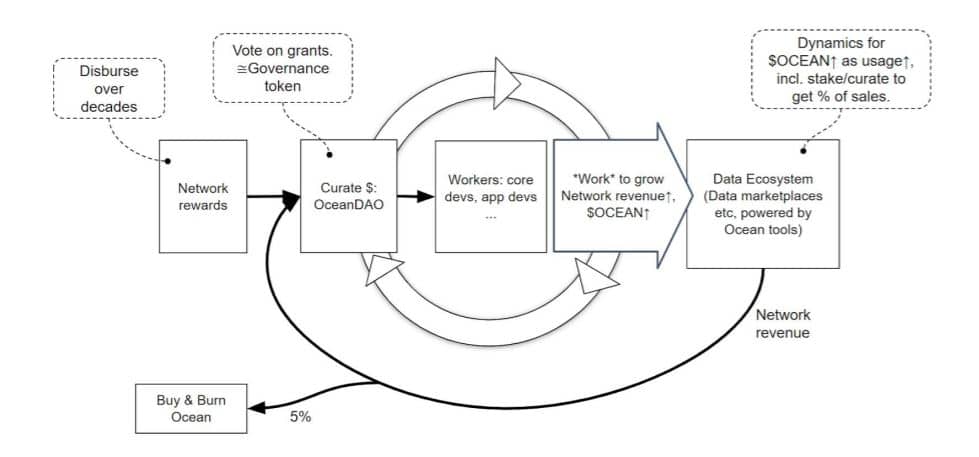 Flow chart detailing the system that powers Ocean Protocol. Image via Ocean Protocol whitepaper. The OCEAN token was created because even though the ecosystem could use an existing token like Ethereum as the unit of exchange, the protocol required a native token to use as a form of rewards and to set monetary policy. That would not be possible if the protocol were using an outside token as a medium of value since the protocol requires control over the money supply. In addition, any volatility in a third-party token would be a disruption to the orderly exchange in the marketplaces created in the Ocean network.