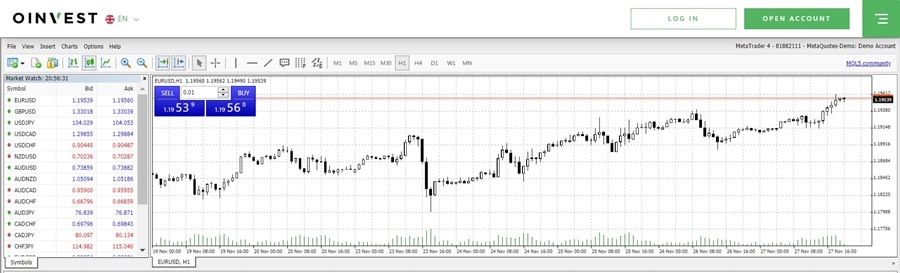 OInvest uses the WebTrader platform offered by MetaTrader 4, giving their client’s access to one of the top charting platforms available right within their browser. No need to download anything, and use it from any internet connected device with a web browser.