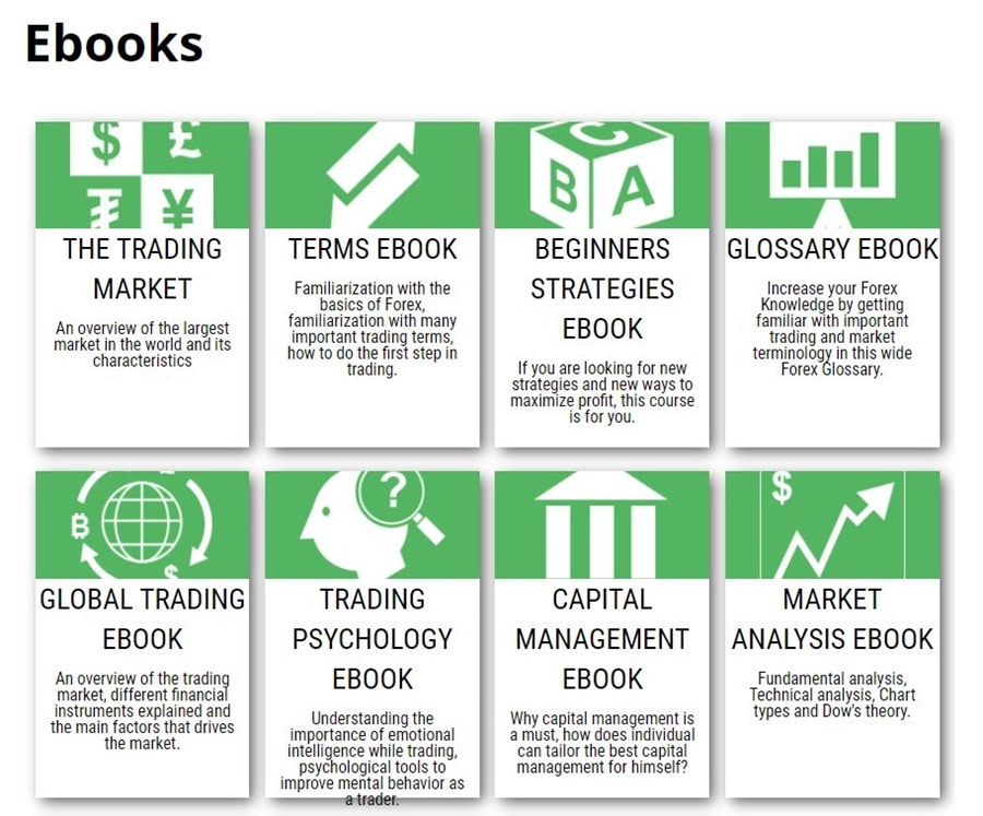 This section of the educational portal will keep you busy for some time as it contains 11 different e-books for you to download and read. Plus there’s material here for all skill levels, from the Beginners Strategies e-book to the Advanced Trading Strategies e-book. Other topics include global trading, trading market, technical analysis (basic and advanced), market analysis, and capital management.