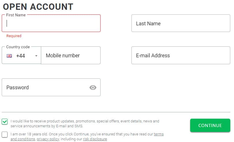 - Enter your first and last name, cell phone number, email address, and chosen password. Agree to the terms and conditions, risk disclosure, and privacy policy by checking the box and then click the 'Continue' button.