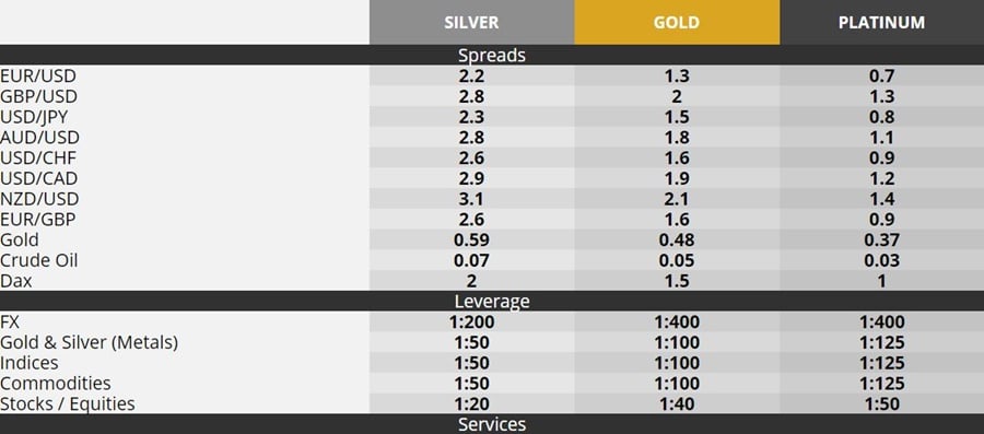 Spreads will differ based on the account type and the instrument being traded. For example, the popular EUR/USD currency pair has an average spread of 2.2 pips for silver account holders, 1.3 pips for gold account holders, and 0.7 pips for platinum account holders. Other currency pairs see a similar reduction in spread based on the account type.