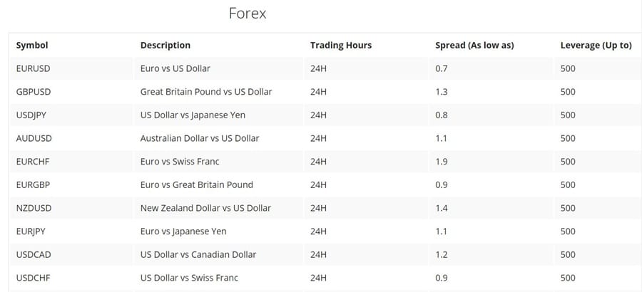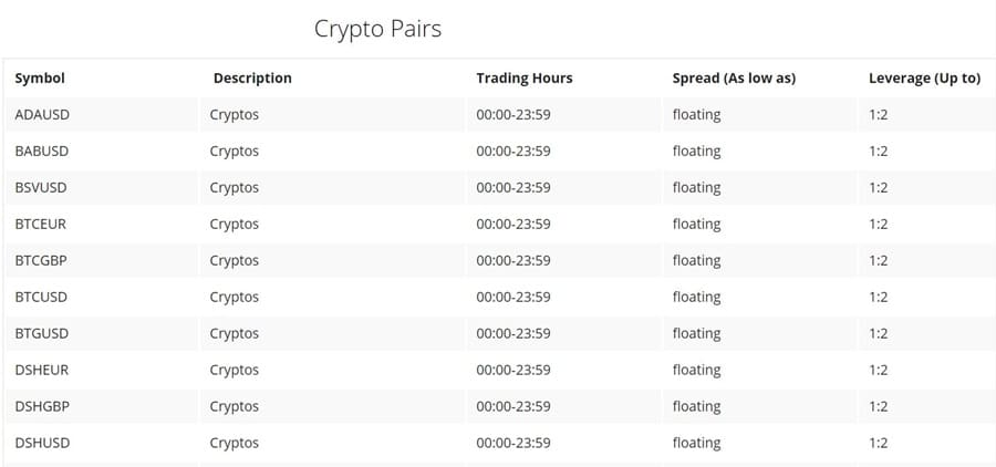 Some of the forex pairs and trading conditions at OInvest. Image via OInvest.com Crypto Pairs