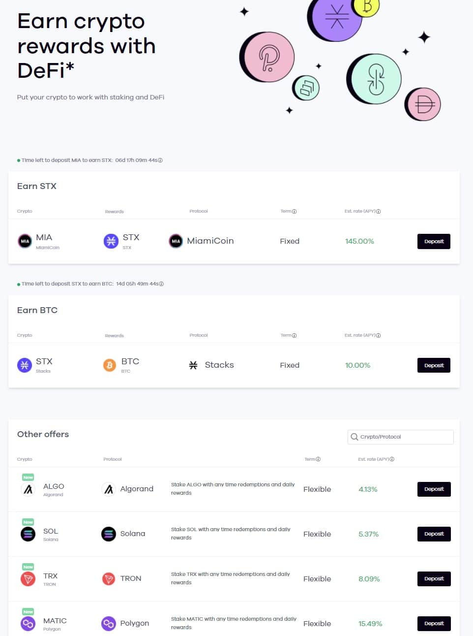 Earn up to an insane 145% APY on tokens like MiamiCoin and around 1.5-16% on over 20 different cryptocurrencies and stablecoins. OKcoin offers higher APY’s on average than many other exchanges as OKcoin utilizes DeFi protocols and allows users to keep 100% of the profits earned without OKcoin taking a cut, which sets them apart from much of the competition.