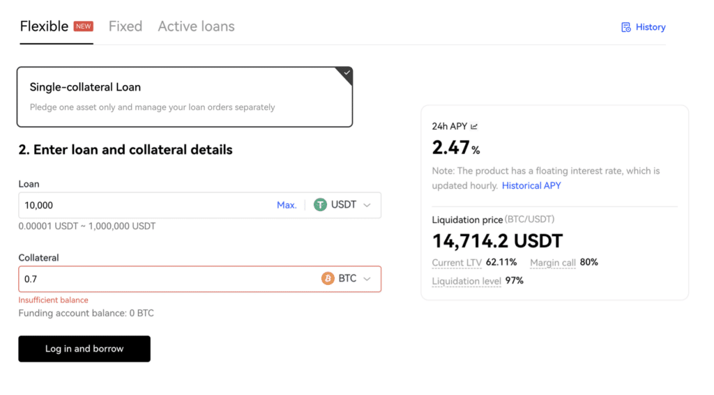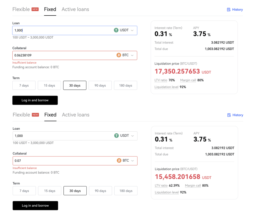 This is the most basic type of loan available on the OKX exchange. The only thing you can borrow is USDT and 4 types of crypto collateral can be used to secure the loan: USDT, BTC, ETH and OKX's native token OKB. The interest rates are fixed based on the amount borrowed, collateral amount provided, and loan duration (7, 15, 30, 90, 180 days). The more collateral and longer duration, the lower the liquidation level.
