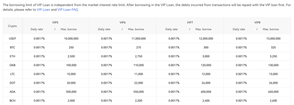 There's another type of loan that can be made on the OKX platform. However, this is reserved for those who are in the VIP5 tier and above. Not only are the interest rates more favorable, but they also have two lending pools to choose from. These are known as the Market Borrow Savings pool and VIP Loans pool. Interest rates for these kinds of loans are based on the number of pools involved and split accordingly.