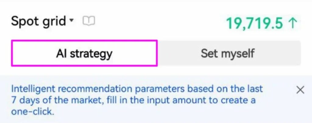 On OKX, Grid bots can be deployed on Spot or Futures trading pairs and traders can set their own parameters or use an AI strategy which is an intelligent recommendation from OKX that sets the parameters based on the last 7 days of market volatility.