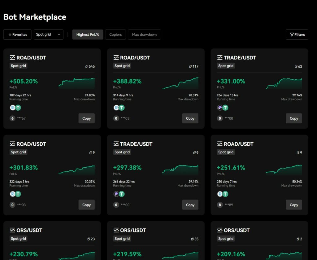 Image via OKXThe marketplace is a great way to sort through bots and traders can see the bot's performance in terms of profit and loss, running time, and max drawdown. Here is a look at the Bot marketplace selection screen: