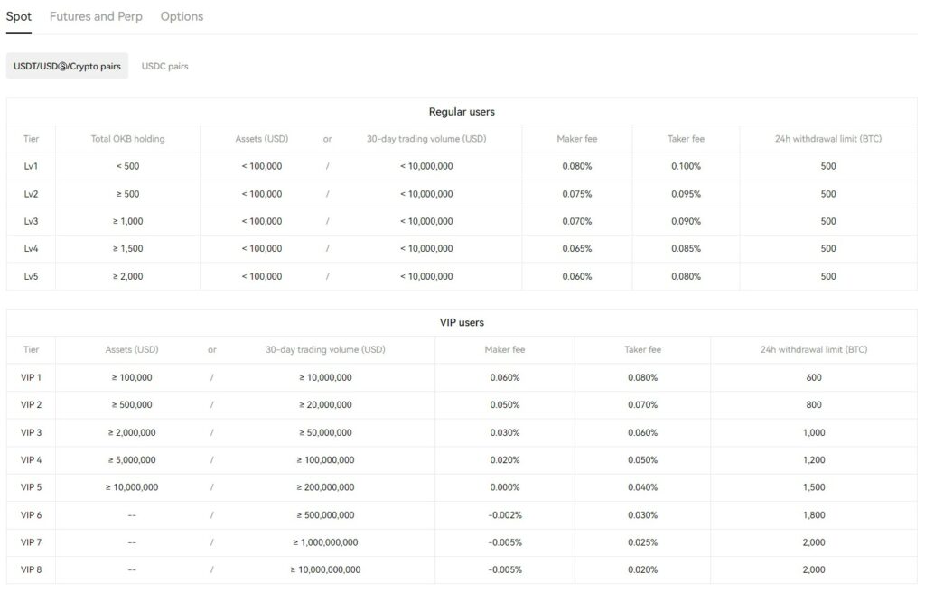 OKX uses a tiered fee structure based on total OKB token holdings, value of assets held, or 30-day trading volume. Here are the fees for spot trading: