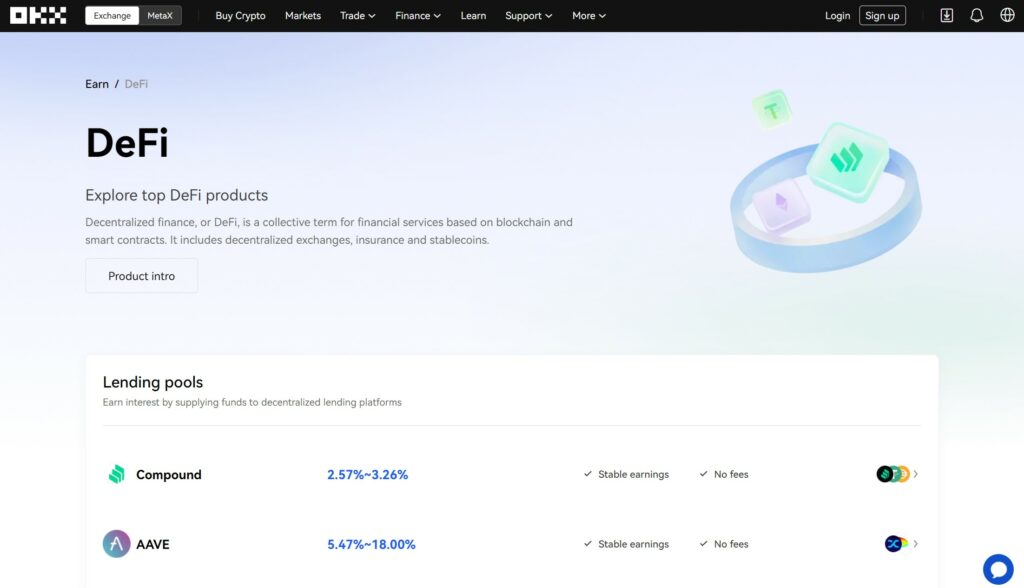 Through OKX and the self-custodial web wallet, DeFi platforms like Aave, Compound Finance, Sushiswap and others can all be accessed all from one place.