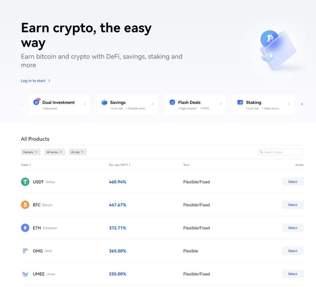 OKX has a multi-product Earn section for users looking to earn passive income on their crypto. There are low-risk and high-risk options available for short and longer-term investments, accommodating different risk appetites and investor profiles.