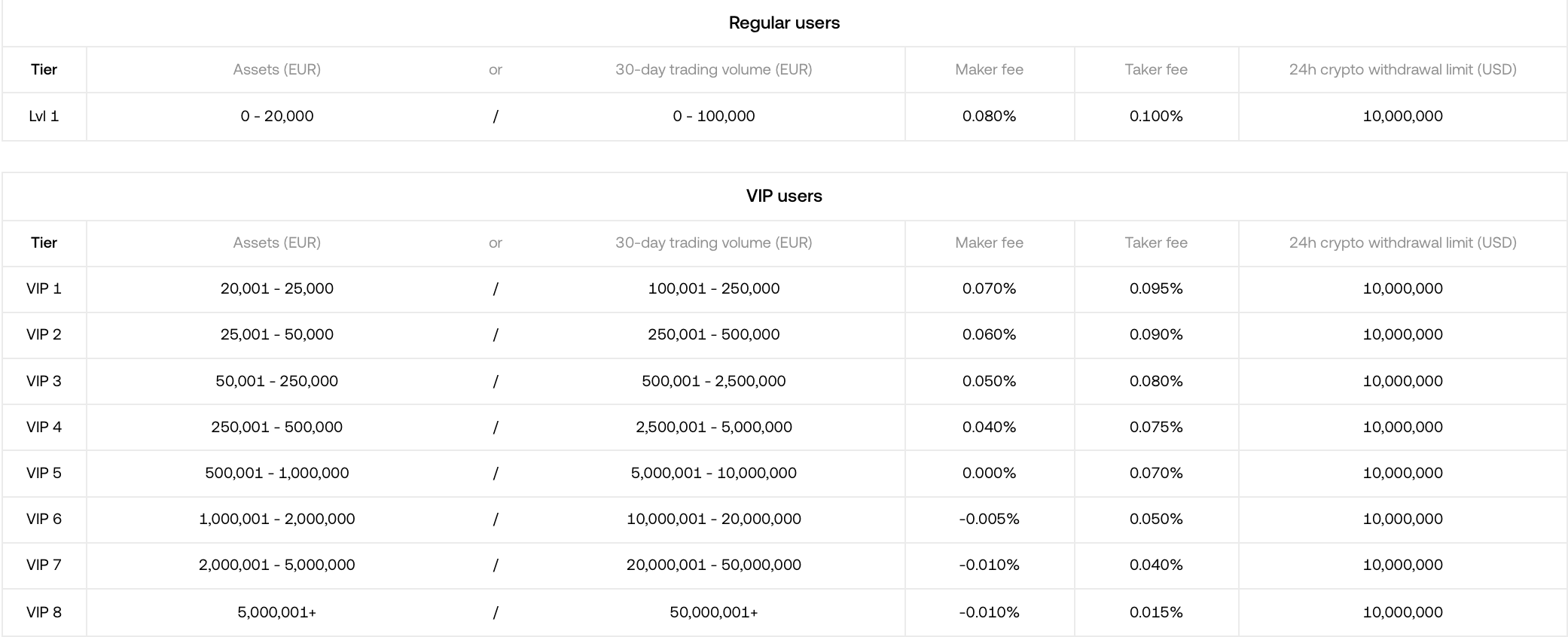 Both crypto exchanges use a tiered fee structure with Maker\Taker fees being determined by a trader’s 30-day rolling trading volume and/or assets held.