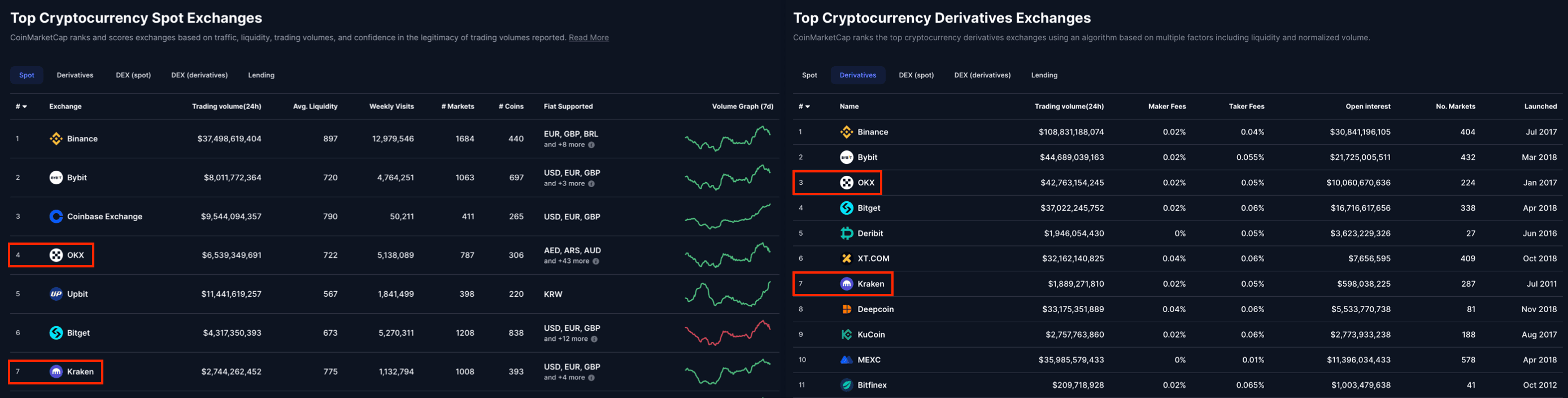 According to Coin Market Cap, OKX is the #4 largest exchange in the world regarding spot trading volume with Kraken sitting at the #7 spot. This ranking is a direct indicator of exchange liquidity, a critical factor for traders who rely on the platform's ability to handle large transactions without significant price impact. OKX enjoys the #3 spot for derivatives trading with Kraken down at the #7 spot at the time of writing.