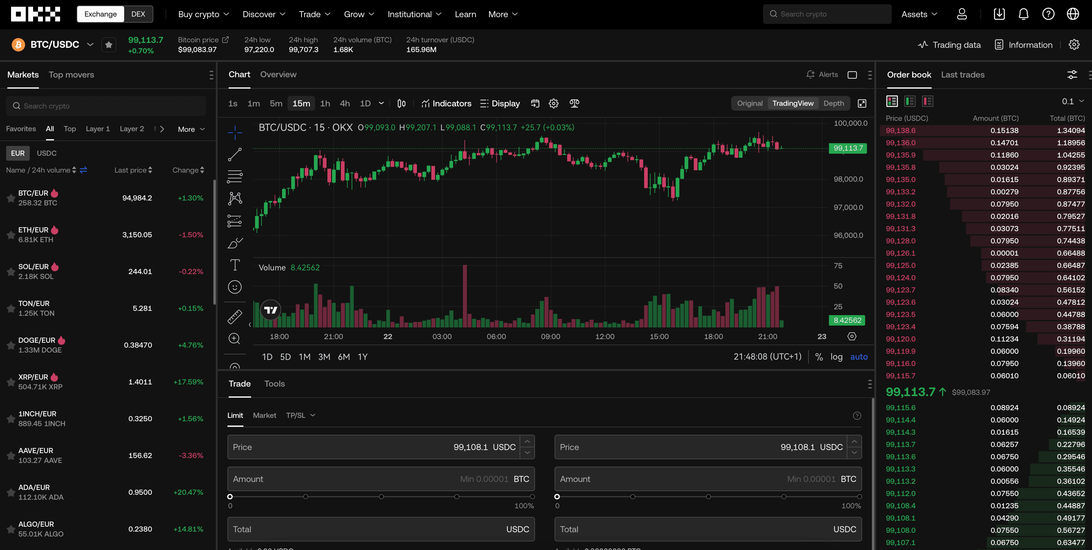 A Look at the OKX Trading InterfaceAside from TradingView, traders can also access OKX’s native trading interface, which provides further functionality and a depth chart. There is also a “basic” trading screen for those who don’t need all the extra features. Trading on OKX is also as high quality as you will find on any of the top exchanges with nearly instantaneous order execution and a world-class matching and trading engine.