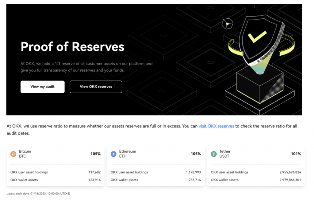 On its PoR webpage, OKX lists a holding of 105% of BTC and ETH each and 101% of USDT. Users can also verify the safety of their own funds, whether held on the exchange or in the wallet, on the same page.