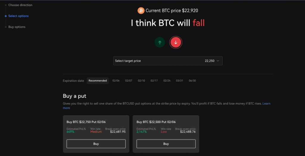 Basic trading has the Spot market and a simplified version of Options. On the trading platform, there is a wide range of timeframes to choose from, with the longest duration of up to 3 months for those who want to see the really big picture. If you want to give Options a try, there are only three steps involved: Choose direction, Select options, and Buy options. Let it be known that options trading is more like gambling. Try not to get stuck in it too much if you can.