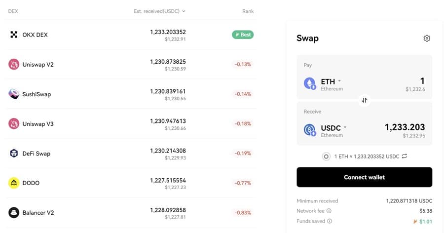 See the best rates and your savings on all swaps. Image via OKXOKX claims that the X Routing algorithm allows them to offer the largest variety of quotes along with the best pricing for all your swaps. It’s convenience, security, and the best exchange rates all in one tool.