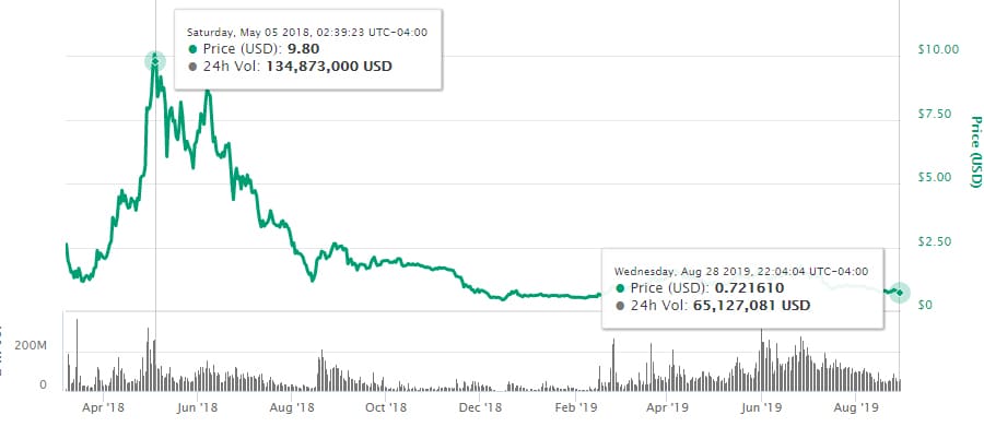 It charged into May 2018 and reached an all-time high of exactly $10.00 on May 3, 2018. After that, it retreated steadily until reaching its all-time low in December. It spent most of 2019 above $1, but has recently dipped and trades at just over $0.77 as of August 28, 2019.
