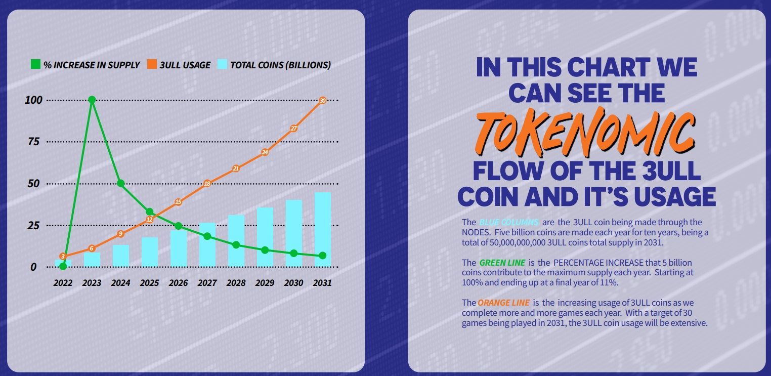 The total maximum supply is set at 50 billion, with the issuance planned over a span of 10 years. A total of 5 billion 3ULL coins will come into existence each year for the next 10 years. This annual issuance is facilitated through nodes, which we'll explore in the next section.