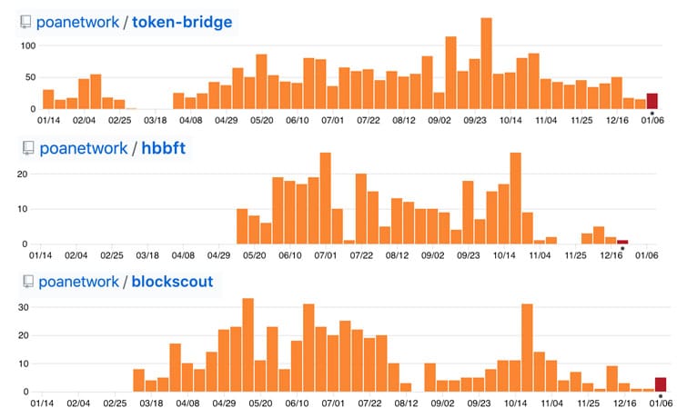 Given the scope of the POA network, there were over 84 repositories on their official GitHub. We decided to look into those that have been the most active over the past 12 months. Below we have three of these repos and the total code commits that occurred over the period.