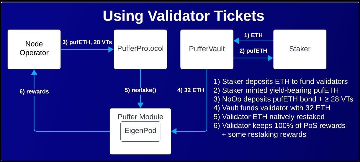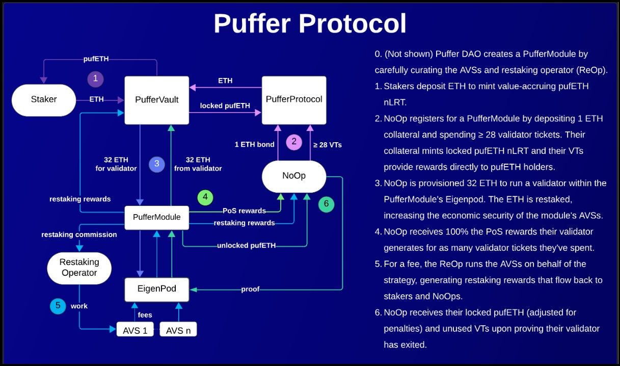 Puffer Finance aims to mitigate these challenges through innovative mechanisms. By allowing users to participate in staking with as little as 1 ETH, Puffer significantly lowers the barrier to entry. Furthermore, Puffer's approach enables stakers and node operators to earn rewards not only from Ethereum staking but also from additional restaking activities through EigenLayer's Actively Validated Services (AVS). This method ensures that the staked ETH can be rehypothecated, providing additional utility and potential returns within the DeFi ecosystem.