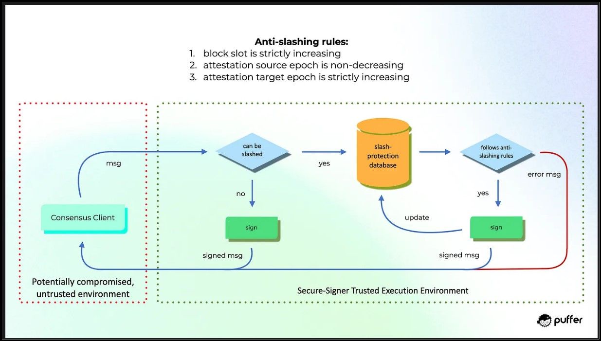 Puffer Secure Signer Implements Anti-Slashing Techniques | Image via Puffer Docs To prevent slashing, Secure-Signer generates and stores all BLS validator keys in its encrypted memory, which is only accessible during runtime. This means the keys can't be misused or exposed, protecting against accidental slashes from double-signing. Additionally, Secure-Signer keeps an integrity-protected database of all previously signed materials, ensuring all signatures follow these rules: