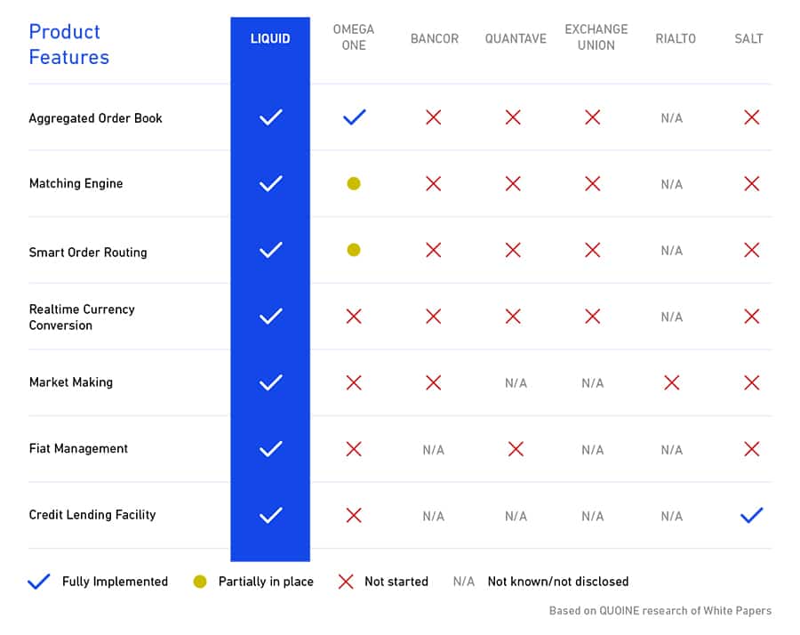 The most glaring omission from many platforms is fiat management, primarily because most of the platforms trying to solve this liquidity problem are being created as decentralized platforms, and are thus finding it difficult to build relationships with banks. Liquid is also the only platform with a functional matching engine and order routing system.