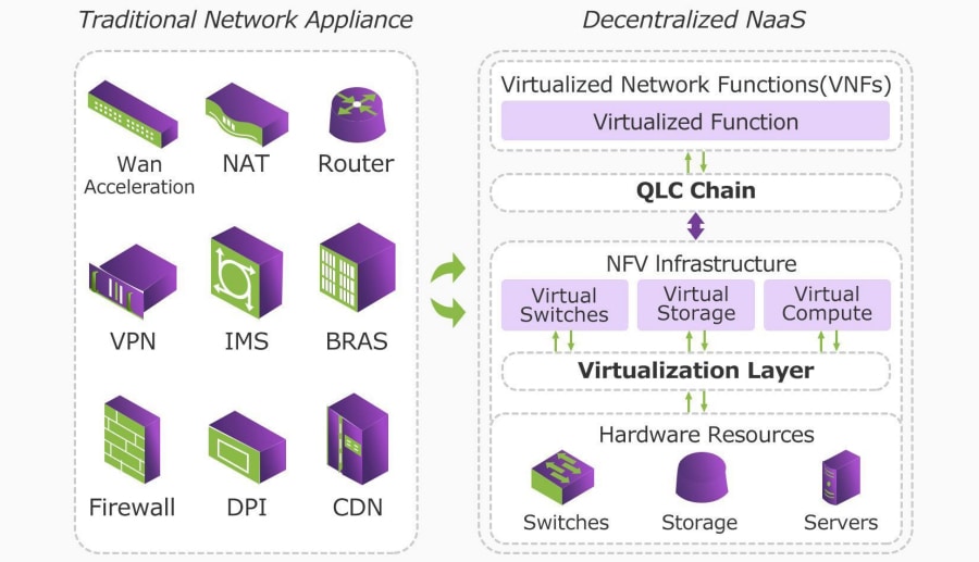 QLC Chain (previously Qlink), is working on decentralized telecommunications in a Network as a Service (NaaS) model. This model hopes to use smart contracts to enable network functionality and access to dApps.