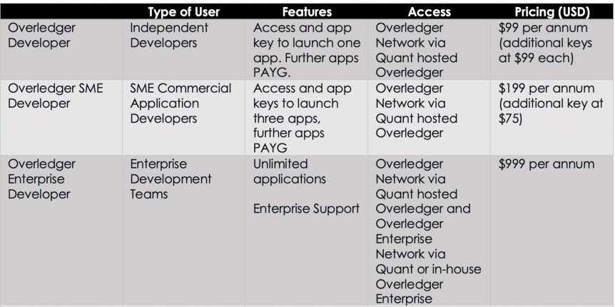 A partial screenshot of the pricing schedule for Overledger OS licensing fees. Like many other software programs, the Overledger OS is not free to use. Both individuals and institutions must pay an annual licensing fee to use the Overledger OS. This fee is fixed for individuals and varies for institutions depending on a number of metrics including the size of their company. Paying this license allows them to create multi-chain apps (or mApps) using the Overledger OS.