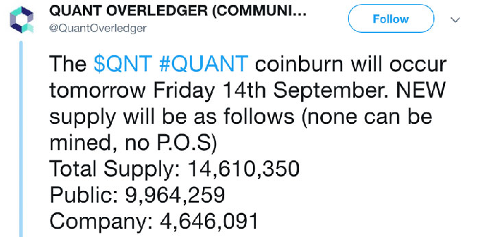 Quant Network's QNT token burn announcement. Roughly 4.5 million tokens have been allocated to the Quant Network, whereas the remaining 10 million tokens are on the market. Quant Network appears to have sold some of their tokens since the 2018 burn, as there is around 12 million QNT currently in circulation.