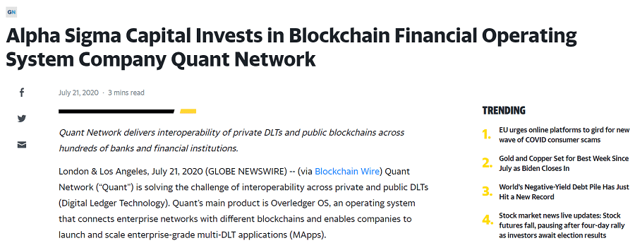 Luckily, in July of this year it was announced that Quant Network had received an undisclosed amount of funding from Alpha Sigma Capital. This seems to have done the trick as the Quant Network is finally in the stages of beta testing its various technologies.