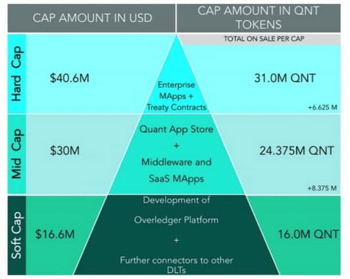 Quant Network's ICO fundraising goals. The QNT ICO seems to have fallen flat, raising just 11 million USD. This was substantially less than its soft cap of around 16 million USD, and almost 4x less than the hard cap of 40 million USD. Given that the ICO price of QNT was around 1.1$USD, this equates to roughly 10 million tokens sold. This confirms the amount in circulation after the 2018 burn which took place just 4 months after the ICO.