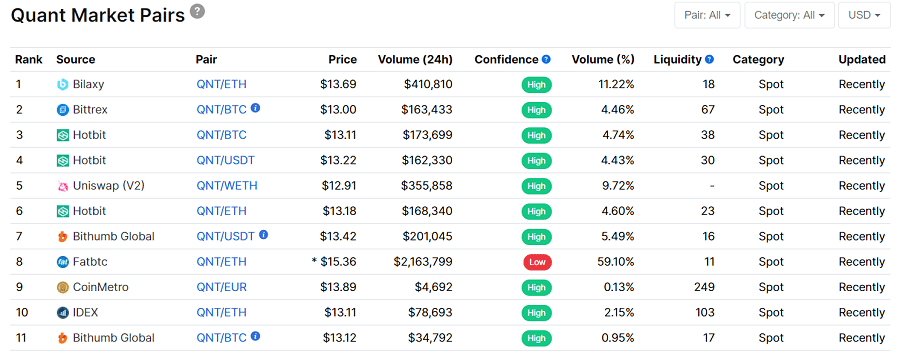 Trading pairs for the QNT token. Image via Coinmarketcap Liquidity is not very good on these exchanges either, meaning you might need to pay a premium if you are looking to buy a lot of QNT. Be sure to stay away from the exchanges with the highest trading volume here – Bilaxy and Fatbtc are known to engage in wash trading and other bad practices.