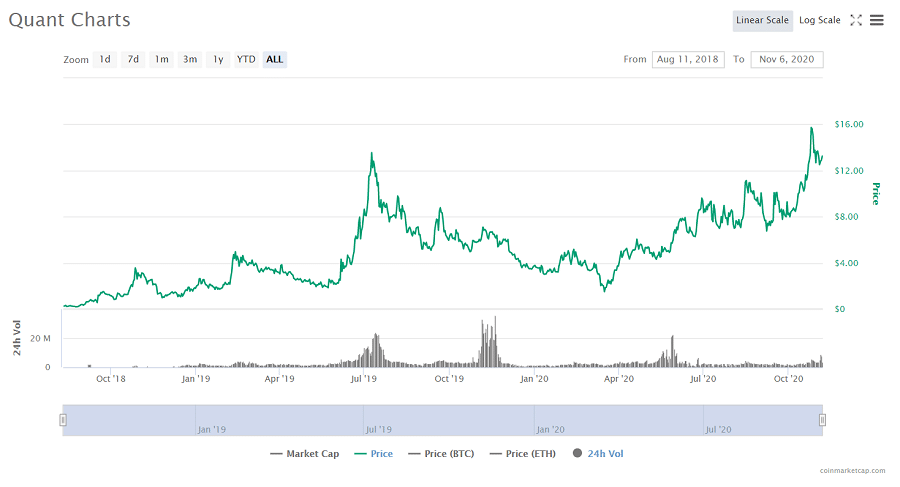 The price history of the QNT token. Image via Coinmarketcap After crashing down to nearly 1.50$USD per token during the flash crash in March, QNT has since recovered. It has even managed to surpass its previous high of 12$USD with a price of nearly 16$ in late October this year. Recent price action remains extremely bullish, but this could be due to market manipulation.