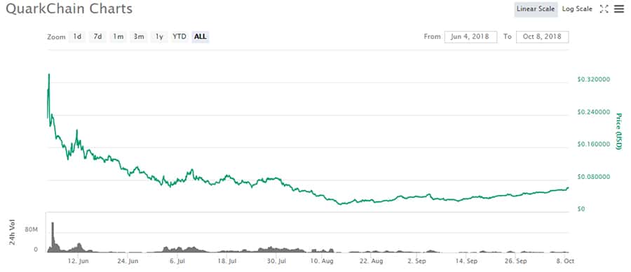 QKC Price Performance since ICO. Image Source: CoinmarketcapThe price of QKC jumped to $0.268 just one day after the ICO, but by June 9, it declined by more than half to $0.129677. After a quick pop higher in June it steadily declined to a low of $0.021378 by August 14, but has been recovering slowly, but surely since then and as of October 8, 2018 is trading at $0.0594, which is still a very nice return from the June 3 ICO price.