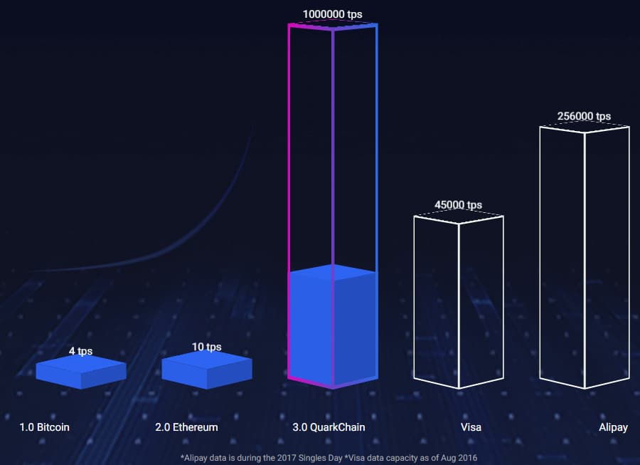 The QuarkChain team specifically mentions Alipay, which has reached 200,000 transactions per second, but has done so by sacrificing decentralization and security. QuarkChain is aiming for scalability that includes decentralization and security, making it a superior network, if the team is successful.