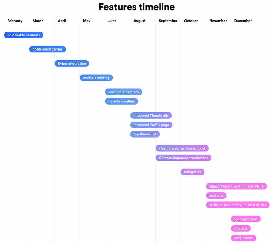 Unfortunately there is no official roadmap for Rarible, and in some cases it seems that the team behind the project is very reactive to events as they unfold, indicating a certain lack of planning. Yet the project has continued to develop rapidly, which is promising for the future development, even lacking a roadmap.