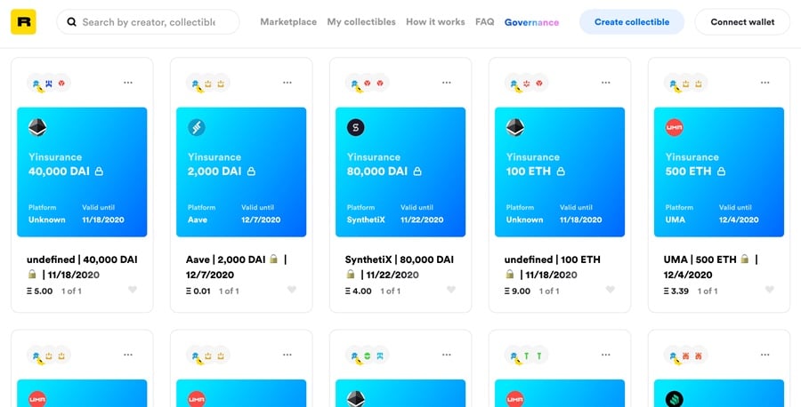 In fact, users began listing the yInsure NFTs on Rarible almost immediately, leading to the development team optimizing support for the assets literally within hours. In addition to having a marketplace for selling these NFTs users also benefit from the Marketplace Liquidity Mining that releases RARI rewards to them as sellers on the platform. It’s another situation where users are able to stack incremental yields on top of each other in the DeFi space.
