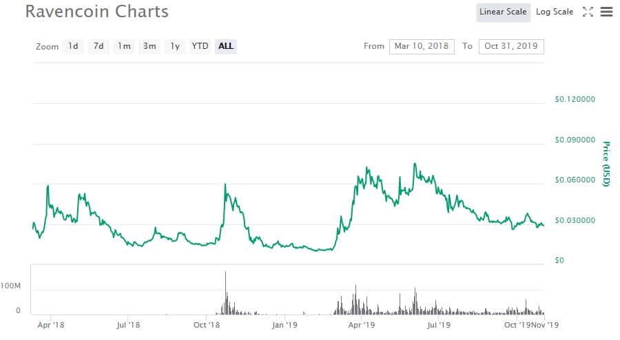 The RVN coin began trading on March 10, 2018 at $0.026499 and by the end of the month it had nearly tripled in value, but that was short-lived.