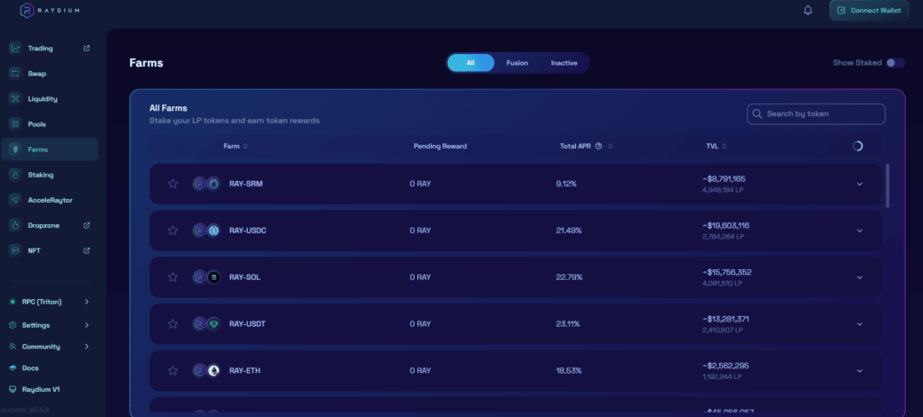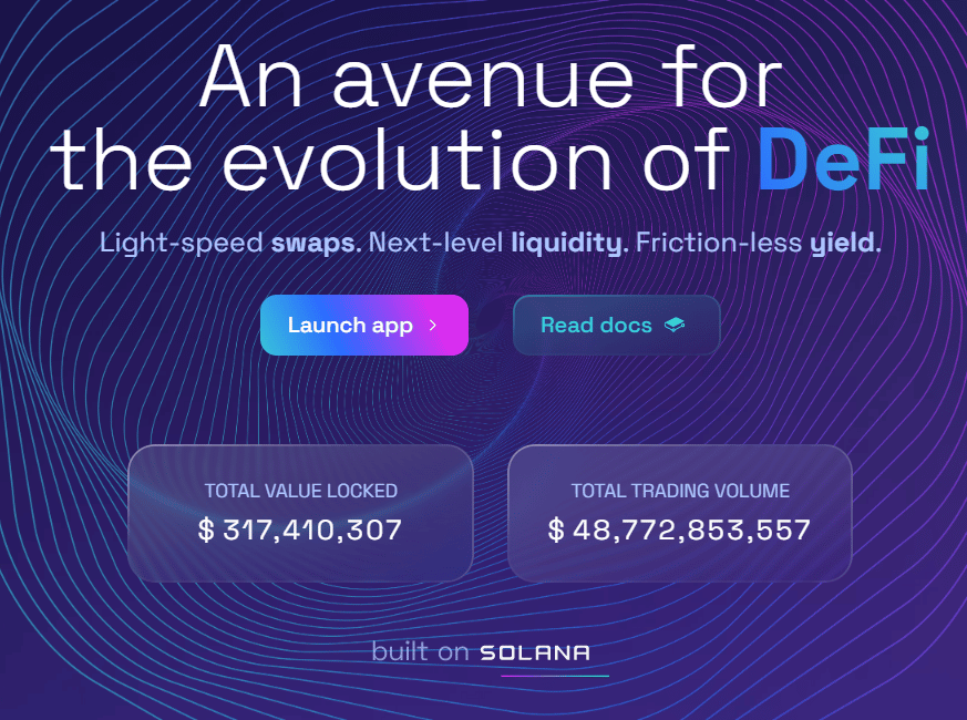 Raydium is an excellent choice if you’re thinking about exploring DeFi on Solana for the first time. Its user interface resembles most DEXs on Ethereum while also showing users Solana’s promise of low latency trading and on-chain order books.
