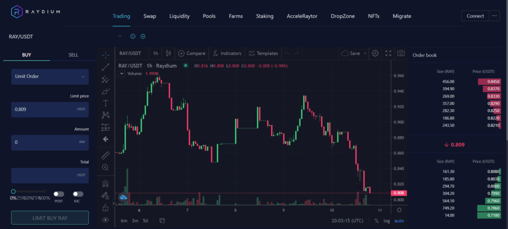 Raydium’s Limit Order Book interface provides users with an experience similar to centralised exchanges, where the user can watch the price chart of the desired token pair and the top buy or sell bids placed by users of the exchange.