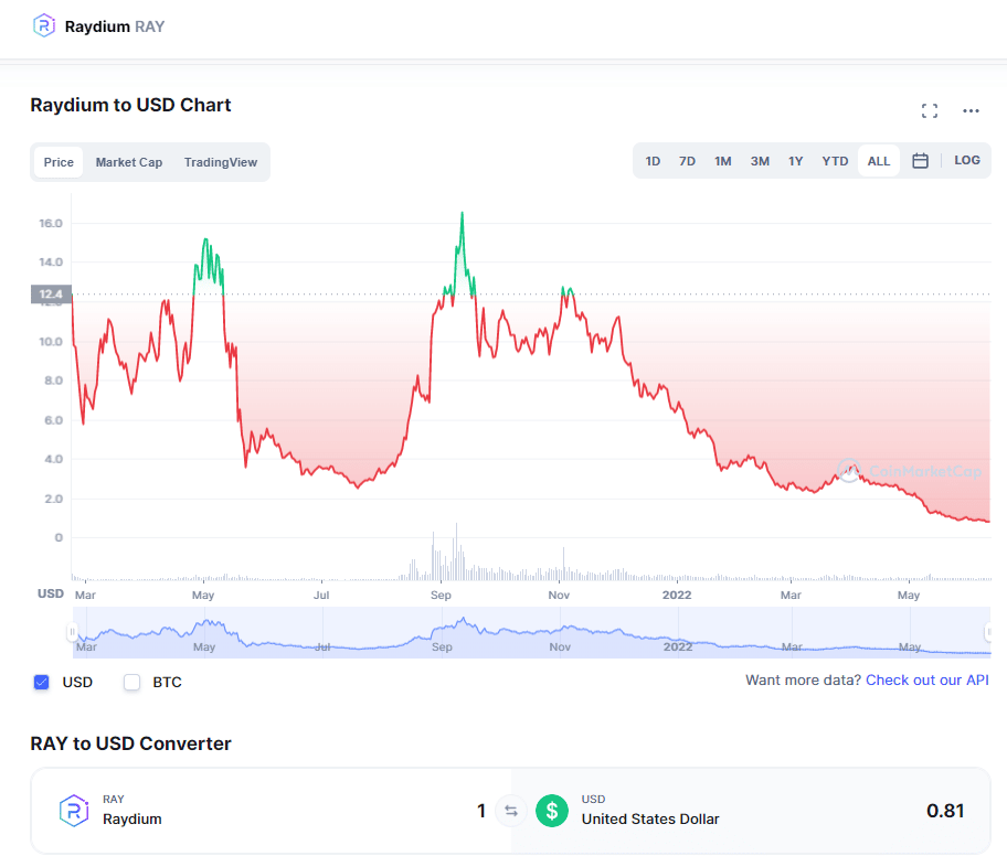 Raydium Price History via CoinMarketCapAccording to CoinMarketCap, RAY seems to be currently trading at $0.80, its all-time-low, with a market cap of $91 million. The token reached an all-time high of $16.93 during the peak of Solana’s rally from $30 to $200 in September 2021. The current price of RAY is likely a result of Solana’s dwindling DeFi TVL caused by its recent serial outages and, of course, the current bear market.