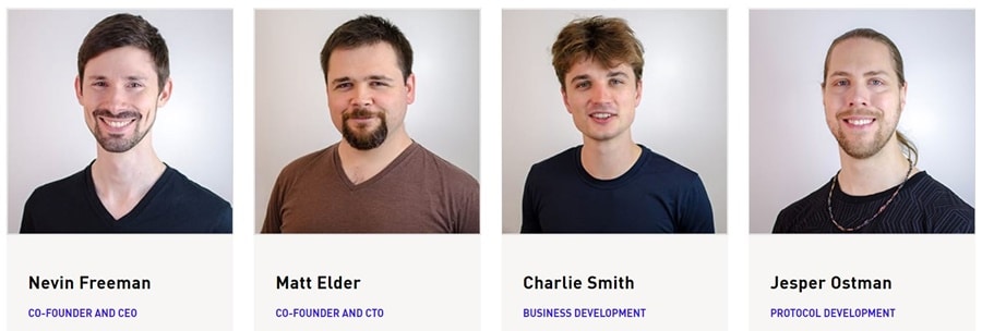 Other team members include Charlie Smith in Business Development, Jesper Ostman and Taylor Brent in Protocol Development, Cathleen Kilgallen as CFO, Mark Lee in Legal, and Erika Campbell in Onsite Operations.
