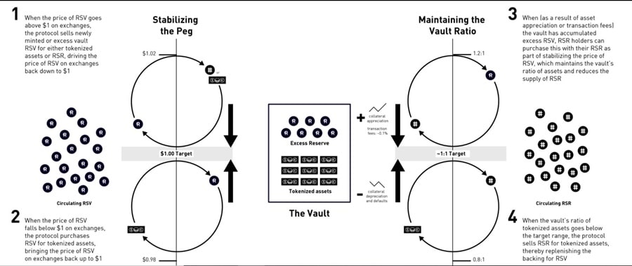 Simple explanation of how the RSV token maintains a stable value. Image via Reserve Protocol blog. If demand increases and the price of RSV rises the same mechanism will return the price to its stable peg. For example, if increased demand causes RSV on the open market to be priced at $1.02 arbitrageurs will step in and purchase the newly minted RSV for $1 and then sell them on the open market for a profit. This will continue until the price on the open market is driven down to $1 by all the RSV selling.
