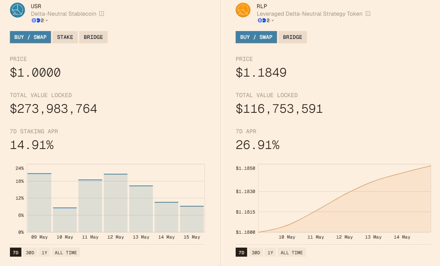 In return for taking on exposure to liquidation losses, negative funding rates, and counterparty risks, RLP token holders earn a much higher yield than USR stakers. These elevated yields aren’t arbitrary—they reflect real risk exposure absorbed by the RLP layer.